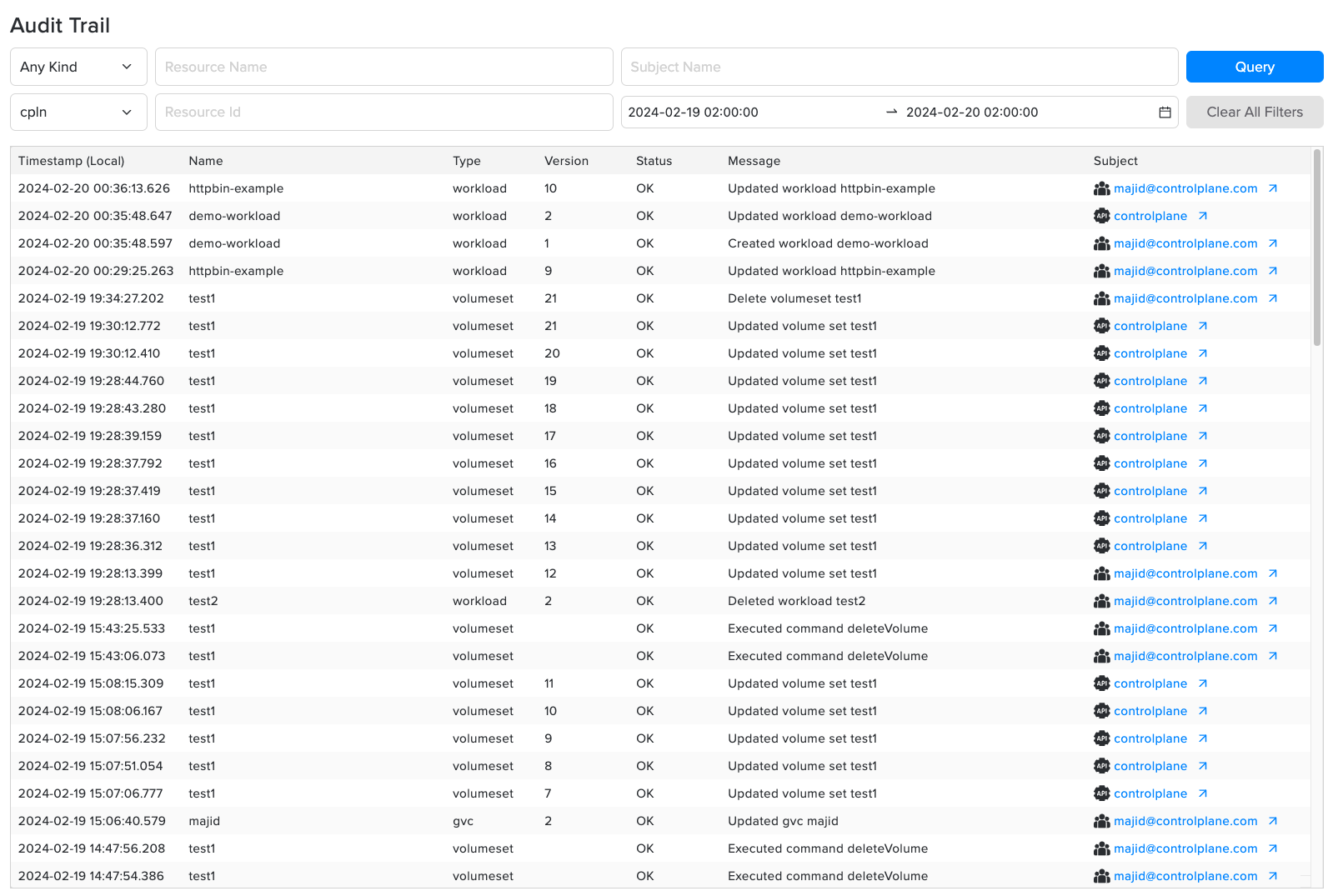 Control Plane exposes a tamper-proof audit trail service for both Control Plane and custom workload actions. A UI is available to search, filter, and view the actions. Each action that occurs on the Control Plane UI console or CLI is reliably captured, securely stored, and indexed using the audit trail. When using the Control Plane UI console, most resources have an audit trail link that will redirect to the audit trail page with the resource ID prefilled. Additional filters can be added to drill-down to specific events. Your custom workloads can leverage this robust audit trail service without having to build your own. Please refer to custom workloads for additional details.Audit Trail UI