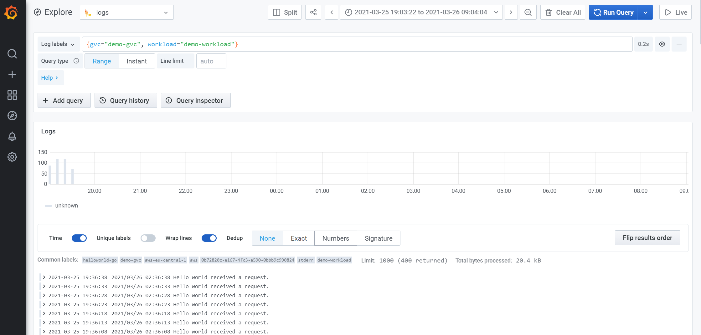 The logs UI displays the logs for your running workloads. No matter which combination of cloud providers or regions your workload is running at, the logs will be aggregated and displayed as if they were running at one provider/region. Filters can be applied to pinpoint any issues that might be occurring at a specific workload. The Grafana explorer is available to query and visualize your log data.